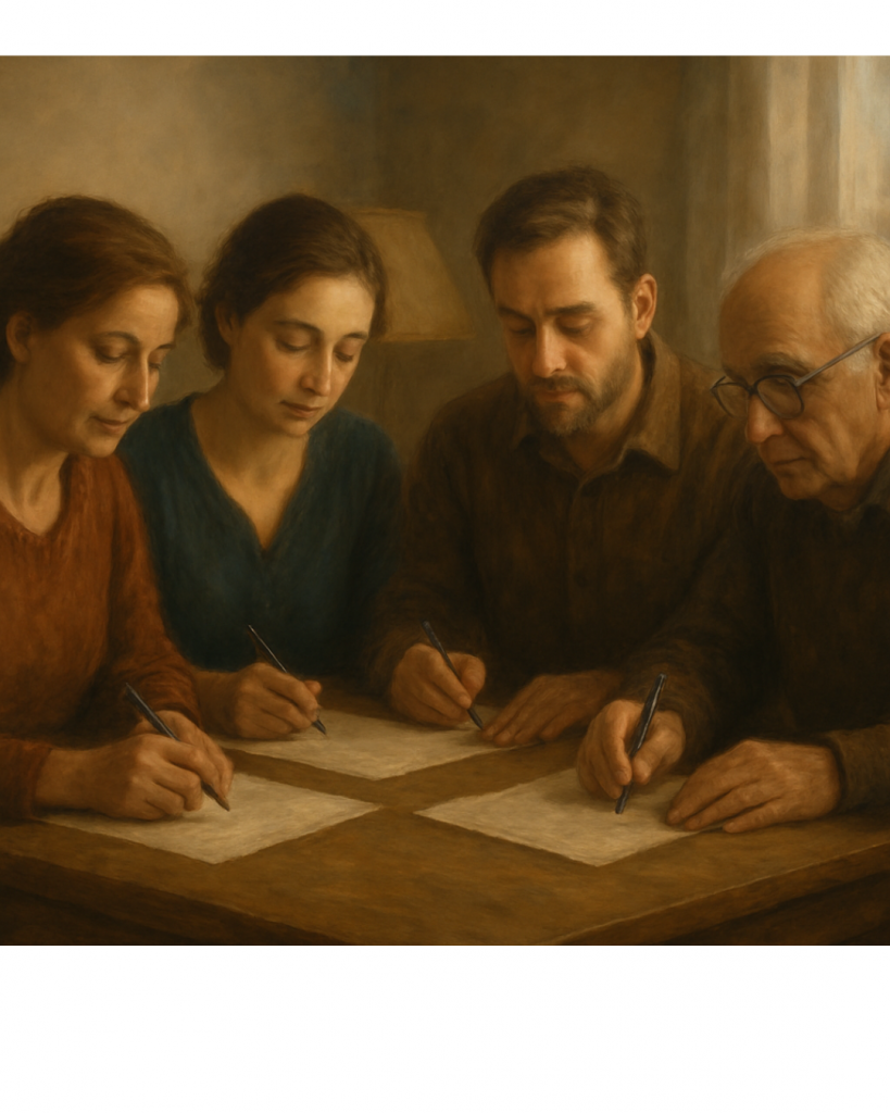 Un samedi après-midi, j’ai franchi la porte d’une maison où l’écriture allait devenir le fil invisible d’une rencontre rare : un père et ses trois enfants, réunis autour d’un atelier offert en cadeau.