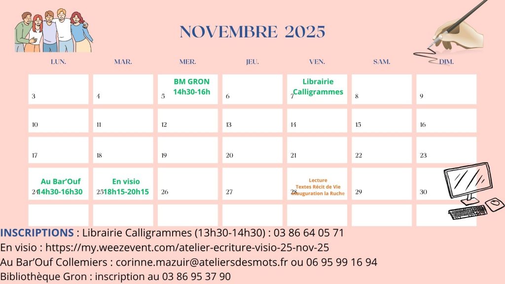 - à La Résidence Orangerie de Domitys avec la bibliothèque des Champs-Plaisants : lecture des textes 28/11 à l’inauguration de la Ruche et démarrage janvier 2026.